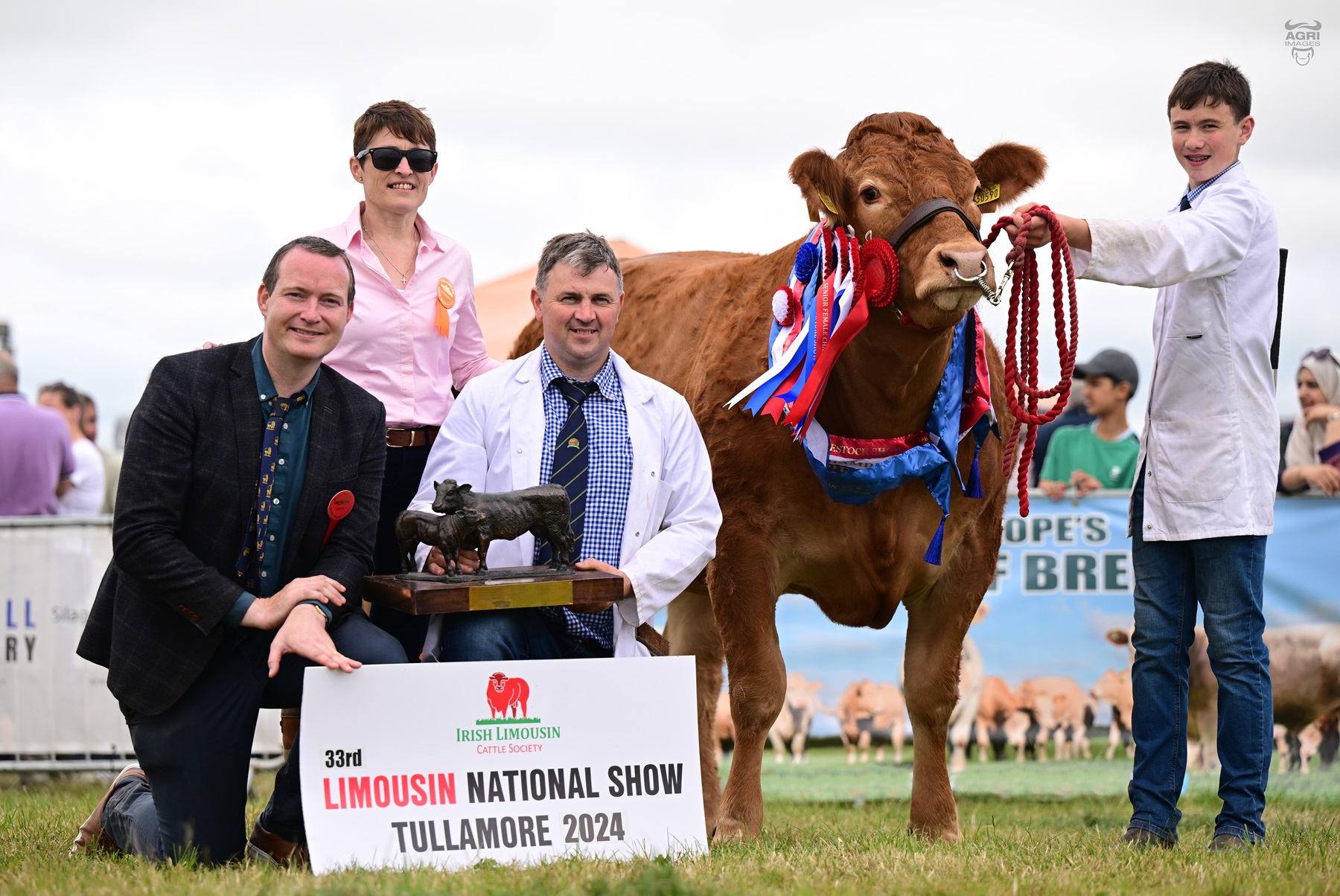 - Henry Savage Jnr, Ann Hester, Eddie and Ben Lynch and Supreme Champion Limousin 2024 Ernevalley Temptress